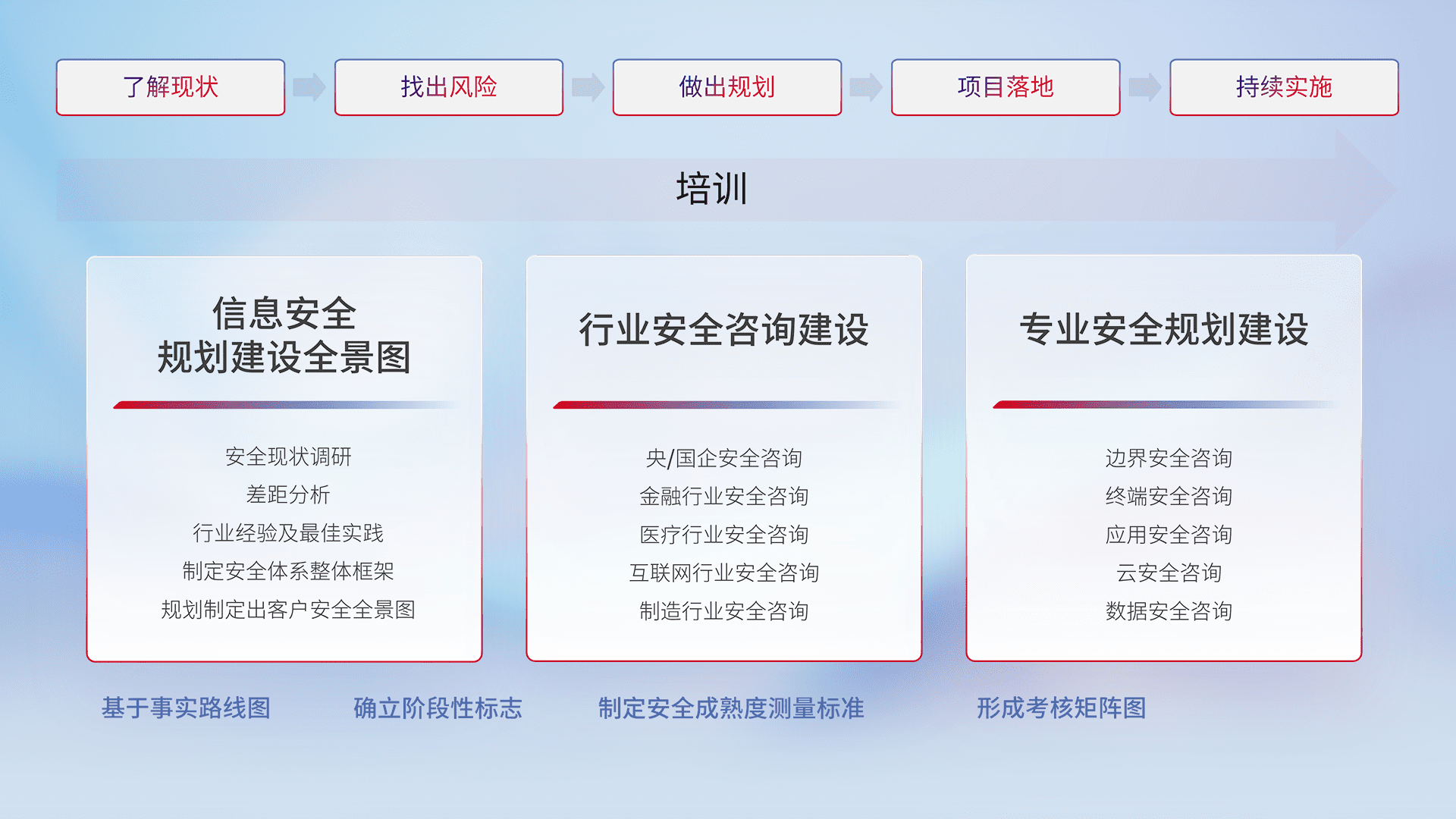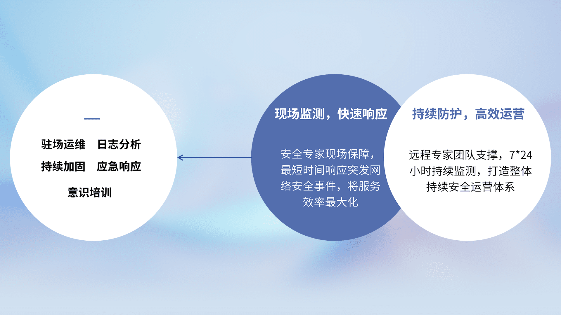 针对客户行业特性,,以专业的安全服务+多厂商联合解决方案提供专属的一站式安全管理服务,,,帮助客户全面感知网络空间威胁,,,,基于识别、、检测、、分析、、防护、、、监测、、、、响应的服务理论模型,,,从方案咨询、、、、集成交付、、、评估验证、、优化加固、、、、运维运营,,致力于为客户提供完整的闭环管理式安全服务。。以实战经验为客户打造高抵御风险的安全体系,,,,帮助客户发现威胁、、、对抗威胁、、、、处置威胁,,不断积累安全对抗能力,,,,持续保障数字化安全。。