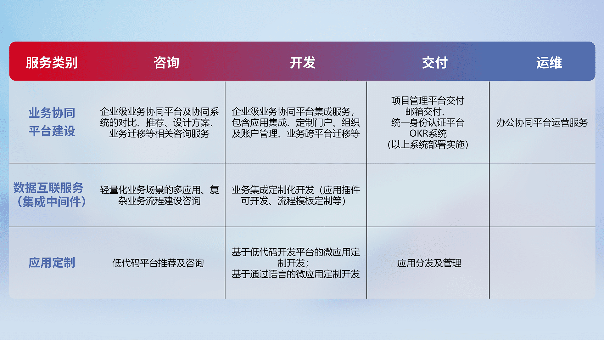 针对钉钉、、企微、、IDaas等平台级产品提供产品的规划、、方案、、、、交付、、、定制化开发等服务,,,实现如统一协同办公、、、、智能客户服务、、、混合会议管理、、智能数据查询、、、等业务场景,,,,实现数字化转型。。。。